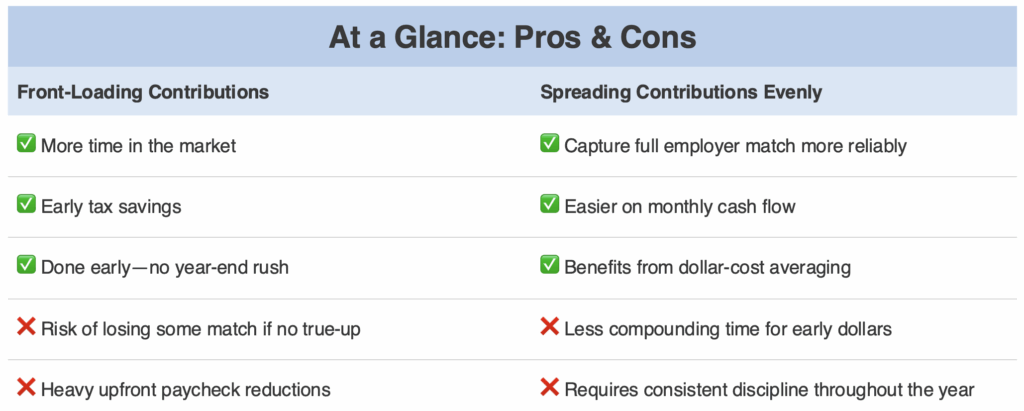 Front-loading can give investments more time to grow, potentially boosting long-term returns. However, without a true-up provision, it may also reduce the employer match. Spreading contributions evenly helps secure the full match, while front-loading offers the advantage of earlier compounding. The best strategy depends on your plan’s rules and your financial goals.