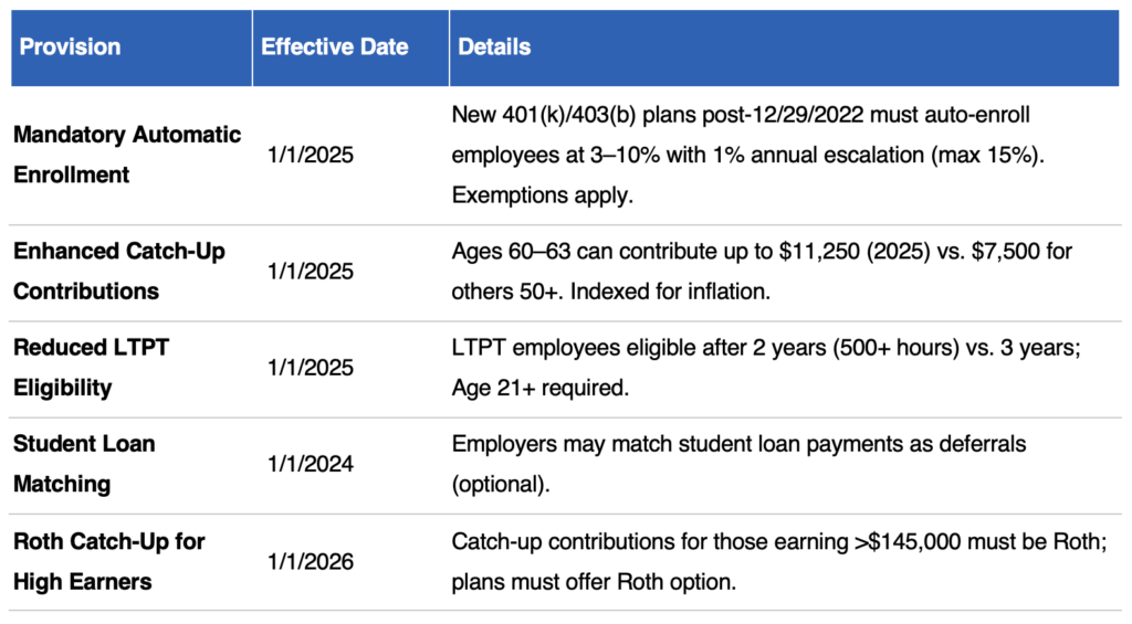 The SECURE Act 1.0 (2019) and SECURE Act 2.0 (2022) have introduced transformative changes to 401(k) and 403(b) retirement plans, aimed at expanding access, increasing savings, and simplifying compliance for businesses, nonprofits, and plan participants. As of January 1, 2025, several provisions are already in effect, while others are slated to take effect on January 1, 2026. This article outlines the key changes relevant to employers/plan sponsors ensuring you stay informed and compliant. Below, we detail the key provisions effective as of 1/1/2025, those expected for 1/1/2026, and provide a visual summary for quick reference.